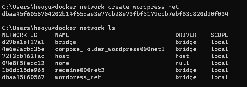 네트워크 생성 후 ls 커맨드로 네트워크 목록을 출력해보면 가장 밑에 "wordpress_net"라는 이름의 네트워크가 생성되었음을 확인할 수 있다.