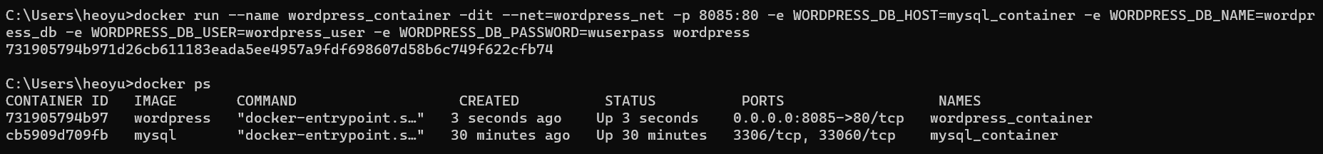 위의 커맨드 입력 후 컨테이너 목록을 출력해보면 wordpress 컨테이너 생성 및 실행되고 있음을 확인할 수 있다.